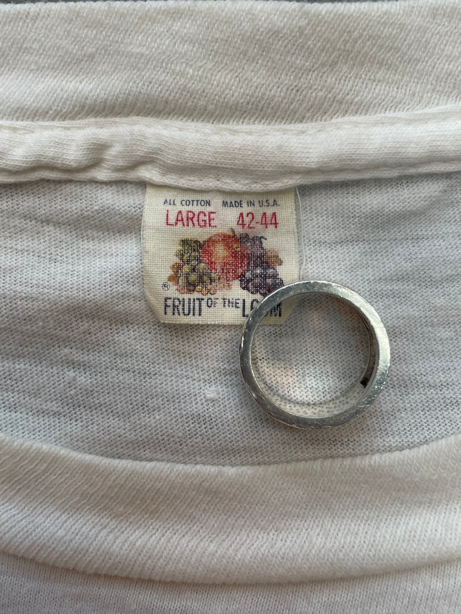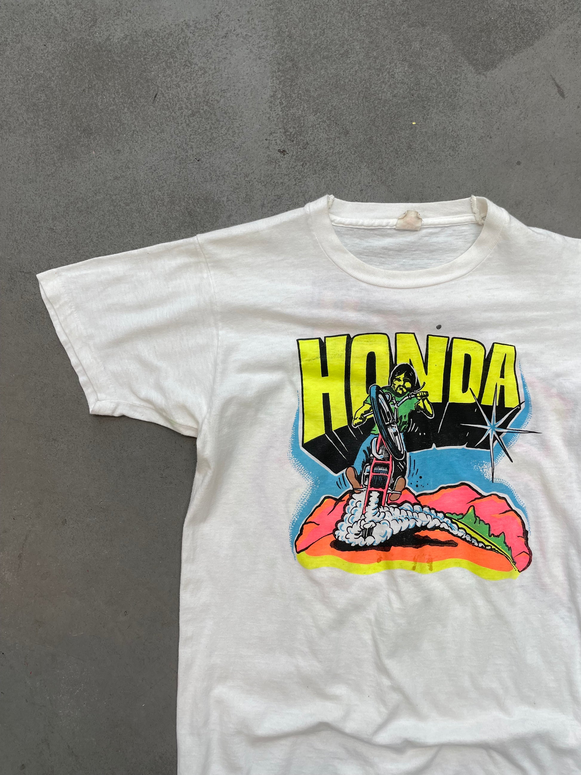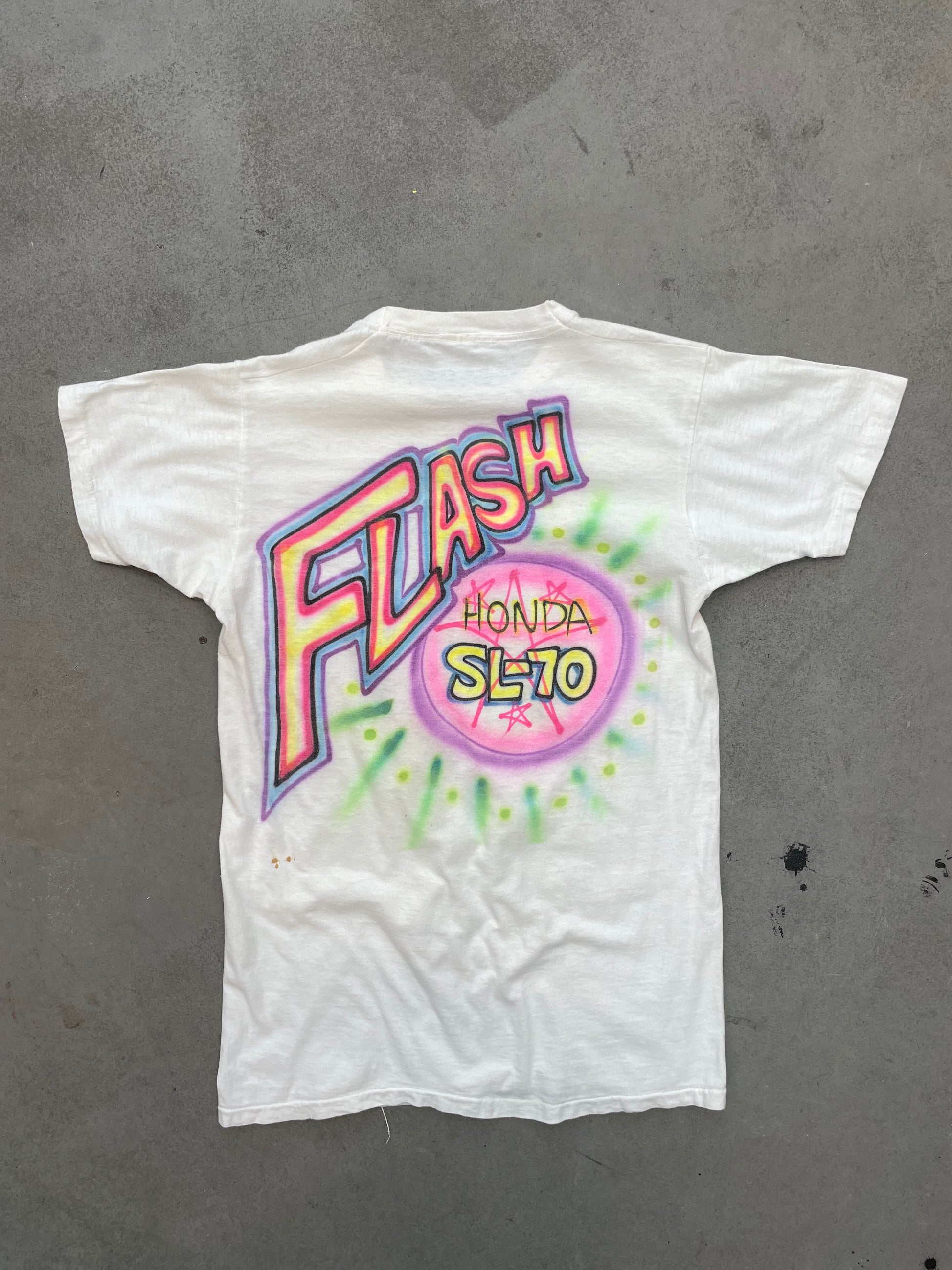 True vintage heads and Honda fans — this one’s for you. This original 1970s Honda SL70 graphic t-shirt is a rare find featuring double-sided artwork with classic airbrush-style graphics. The front showcases a vivid motocross-style scene with a dirt bike launching over a neon landscape, while the back pops with bold “FLASH” lettering and “Honda SL70” callout in graffiti-style lettering