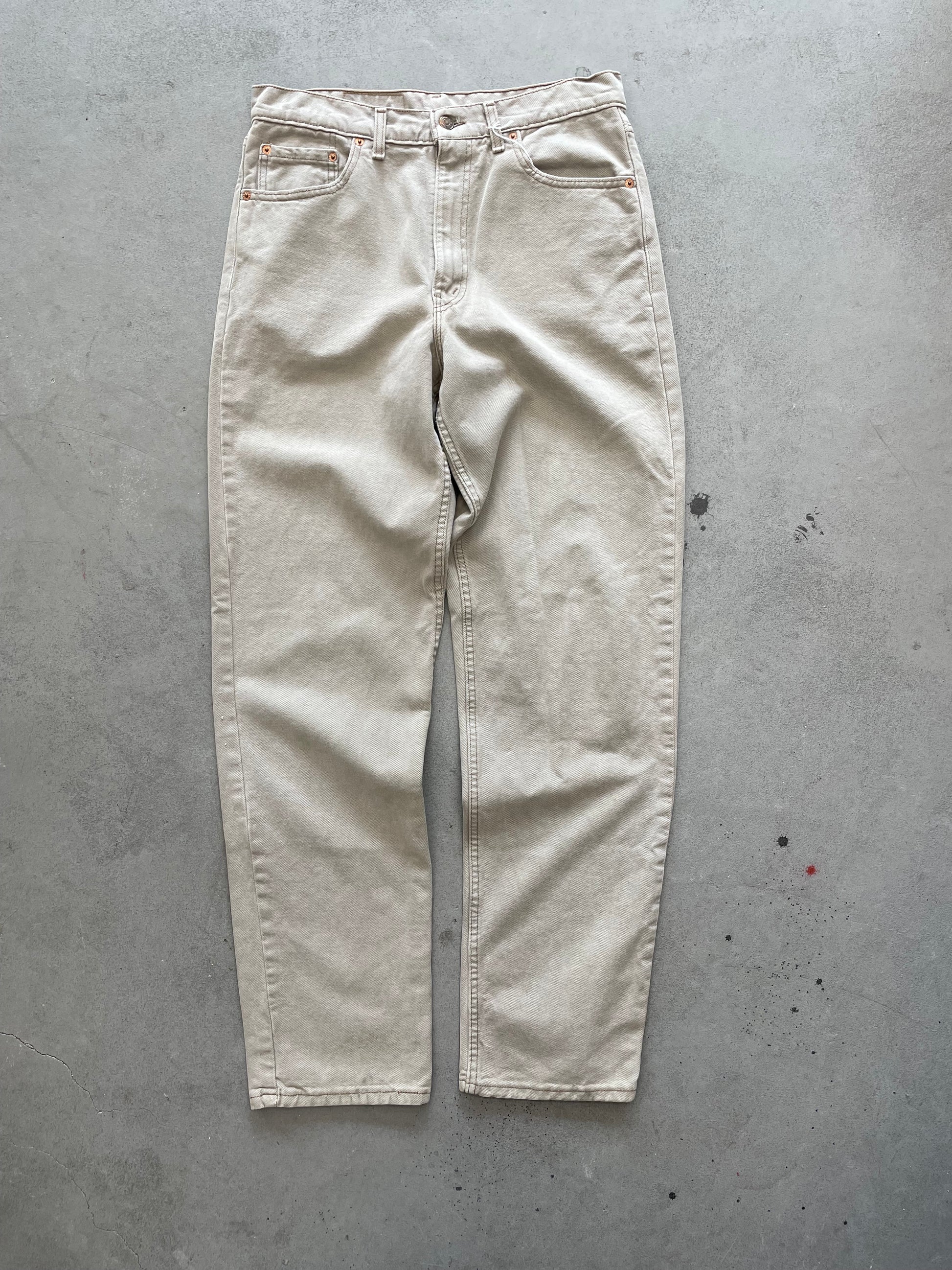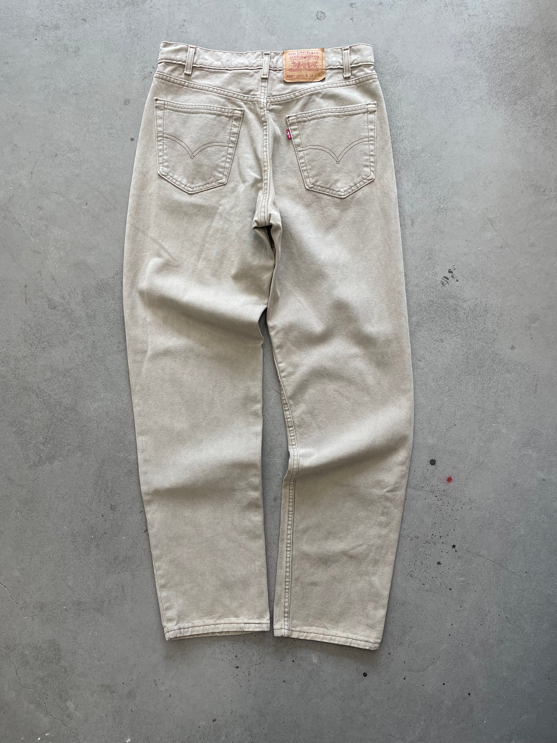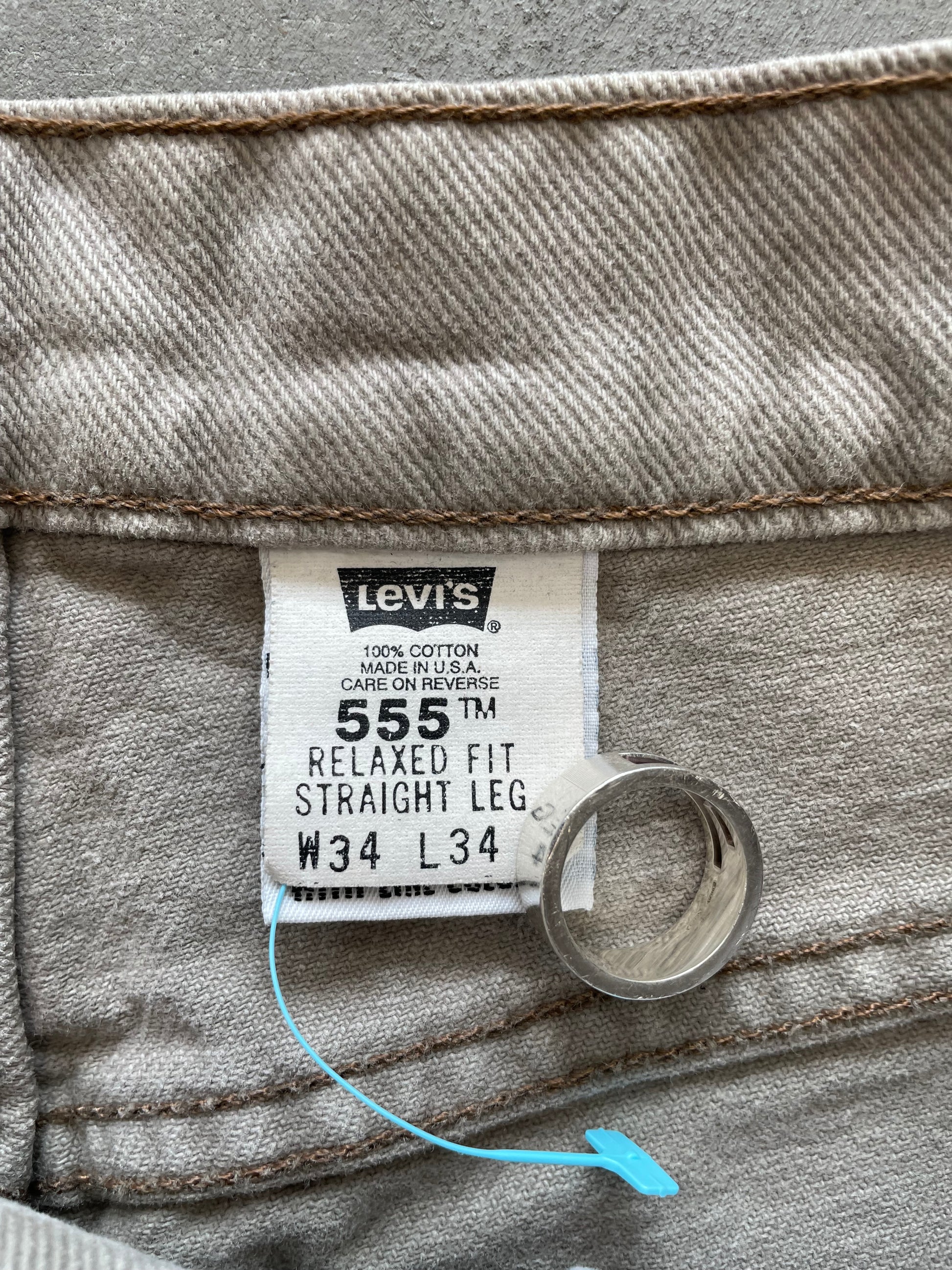 Clean and classic with that vintage ease — these 1990s Levi’s 555 jeans in tan are a laid-back essential. Made from soft cotton twill in a neutral khaki-tan tone, the 555 cut offers a relaxed fit through the thigh with a slight taper, making them perfect for everyday wear with a ‘90s twist.