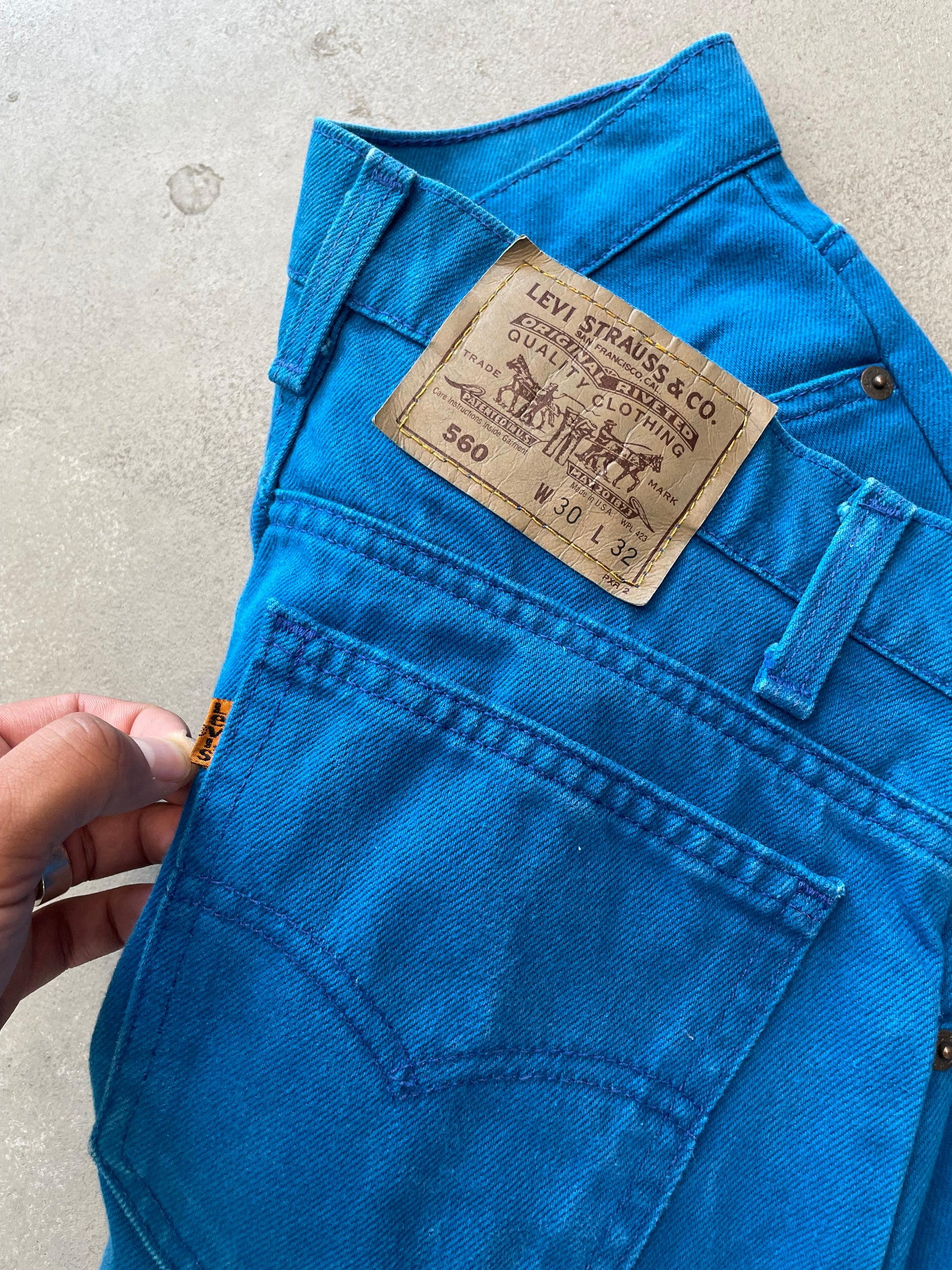 These vintage Levi’s 560 jeans from the 1990s feature the classic loose fit and tapered leg that defined the era, finished in a vibrant mid-to-light blue wash—richer and deeper than sky blue, with just the right amount of retro edge. Made under Levi’s orange tab line, known for its youthful, fashion-forward cuts, these jeans offer a relaxed silhouette with a comfortable rise and roomy thigh.