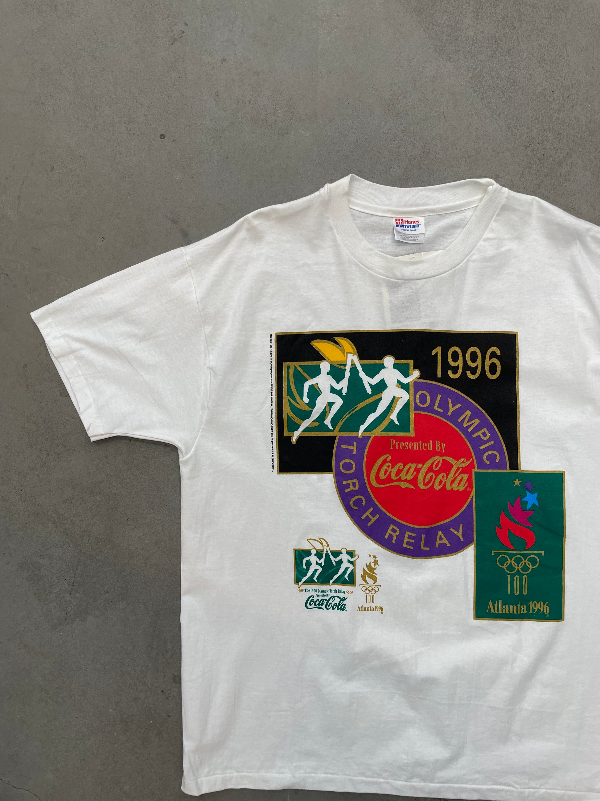 Celebrate a legendary moment in sports history with this deadstock 1996 Atlanta Olympic Games t-shirt featuring a bold Coca-Cola co-branded graphic. This tee is a true piece of 90s nostalgia, untouched and unworn since the original release nearly three decades ago.